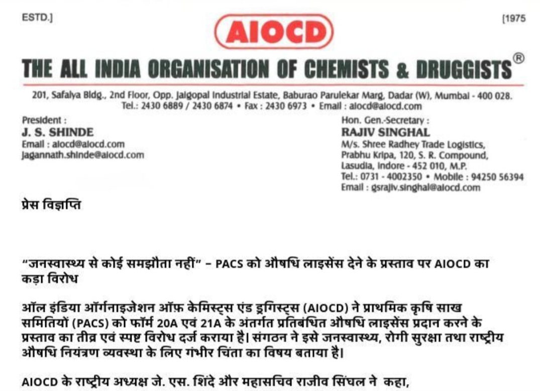 जनस्वास्थ्य से खिलवाड़ नहीं होने देंगे” – PACS को दवा लाइसेंस देने के : प्रस्ताव पर AIOCD का तीखा विरोध