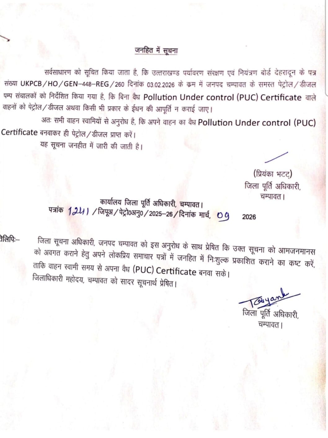 बिना PUC सर्टिफिकेट के नहीं मिलेगा पेट्रोल-डीजल, जिला पूर्ति : अधिकारी चंपावत
