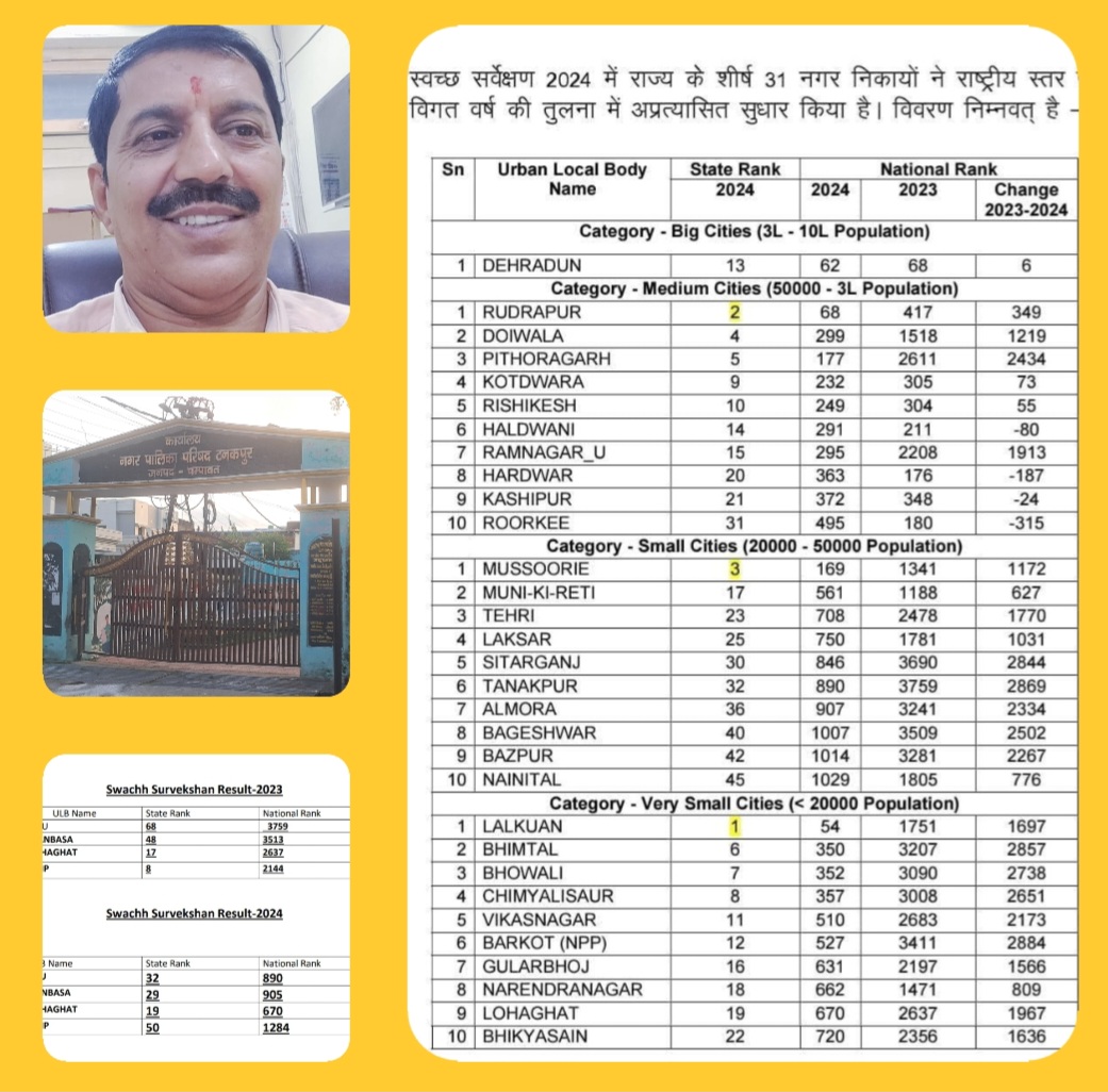 टनकपुर/ केंद्रीय आवासान और शहरी कार्य मंत्रालय की स्वच्छता रैंकिंग में इस बार टनकपुर नगर पालिका ने भी शानदार प्रदर्शन किया है। वर्ष 2023की तुलना में नगर पालिका टनकपुर स्टेट रैंकिंग में 68 वे स्थान से खिसककर 32 वें तथा नेशनल रैंकिंग में 3759 से घटकर 890 पर आ गई है। डोर टू डोर कूड़ा एकीकरण में राज्य का प्रदर्शन पिछले साल के 69.76 प्रतिशत से गिरकर 56.6% पर आ गया है। राष्ट्रीय स्वच्छता रैंकिंग में 20000 से 50000 तक की आबादी वाले शहरों में जनपद चंपावत का टनकपुर शहर भी जगह बनाने में कामयाब रहा। देश के तमाम शहरों में टनकपुर की रैंकिंग मे भी सुधार आया है।