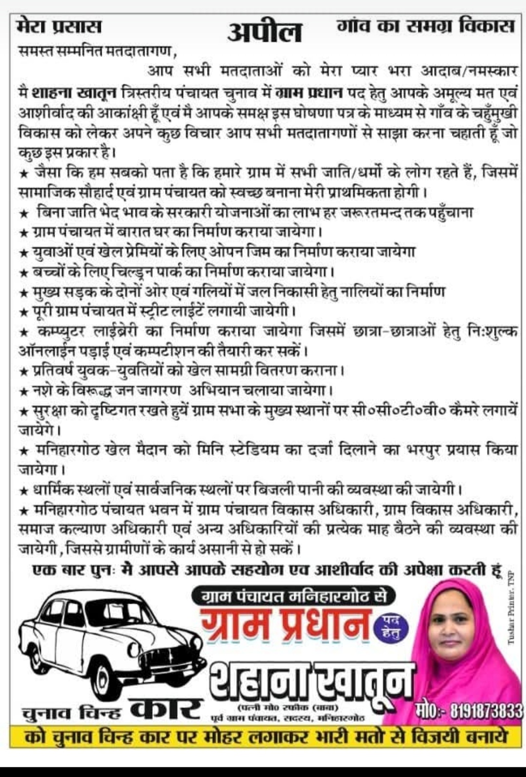 क्षेत्र के लोगों ने ग्राम प्रधान पद की दावेदार शहाना खातून को वोट देने का भरोसा दिलाया। शक्ति प्रदर्शन के दौरान हजारों समर्थको में बुजुर्ग नौजवान एवं महिलाएं शामिल रहे। मीडिया से मुखातिब होते हुए शहाना ने क्षेत्र के मतदाताओं से उनके पक्ष में आगामी 28 जुलाई को मतदान कर उनके हाथों को मजबूत करने की अपील की। इस दौरान उन्होंने कहा की विकास के नाम पर कहीं भी कोई समझौता बर्दाश्त नहीं किया जाएगा। वह 24 घंटे जनता की सेवा के लिए तैयार रहेंगी। कहा कि ग्राम पंचायत मनिहारगोठ में सभी धर्म के लोग रहते हैं जिसमें सामाजिक स्वभाव एवं ग्राम पंचायत को स्वच्छ बनाना उनकी पहली प्राथमिकता होगी। मनिहारगोठ खेल मैदान में मिनी स्टेडियम का दर्जा दिलाने का भरपूर प्रयास किया जाएगा। युवाओं एवं खेल प्रेमियों के लिए ओपन जिम का निर्माण कराया जाना, जल निकासी के लिए सड़क के दोनों और नालियों का निर्माण, पंचायत में स्ट्रीट लाइट लगाए जाने, कंप्यूटर लाइब्रेरी का निर्माण, नशे के विरुद्ध अभियान चलाने, सुरक्षा की दृष्टि से ग्राम सभा के मुख्य स्थानो पर सीसीटीवी कैमरे लगाए जाने, छोटी-मोटी समस्याओं के निराकरण के लिए अधिकारियों द्वारा हर महीने कैंप करने, सरकारी योजनाओं का लाभ दिलाए जाने कभी क्षेत्र की जनता से वादा किया।