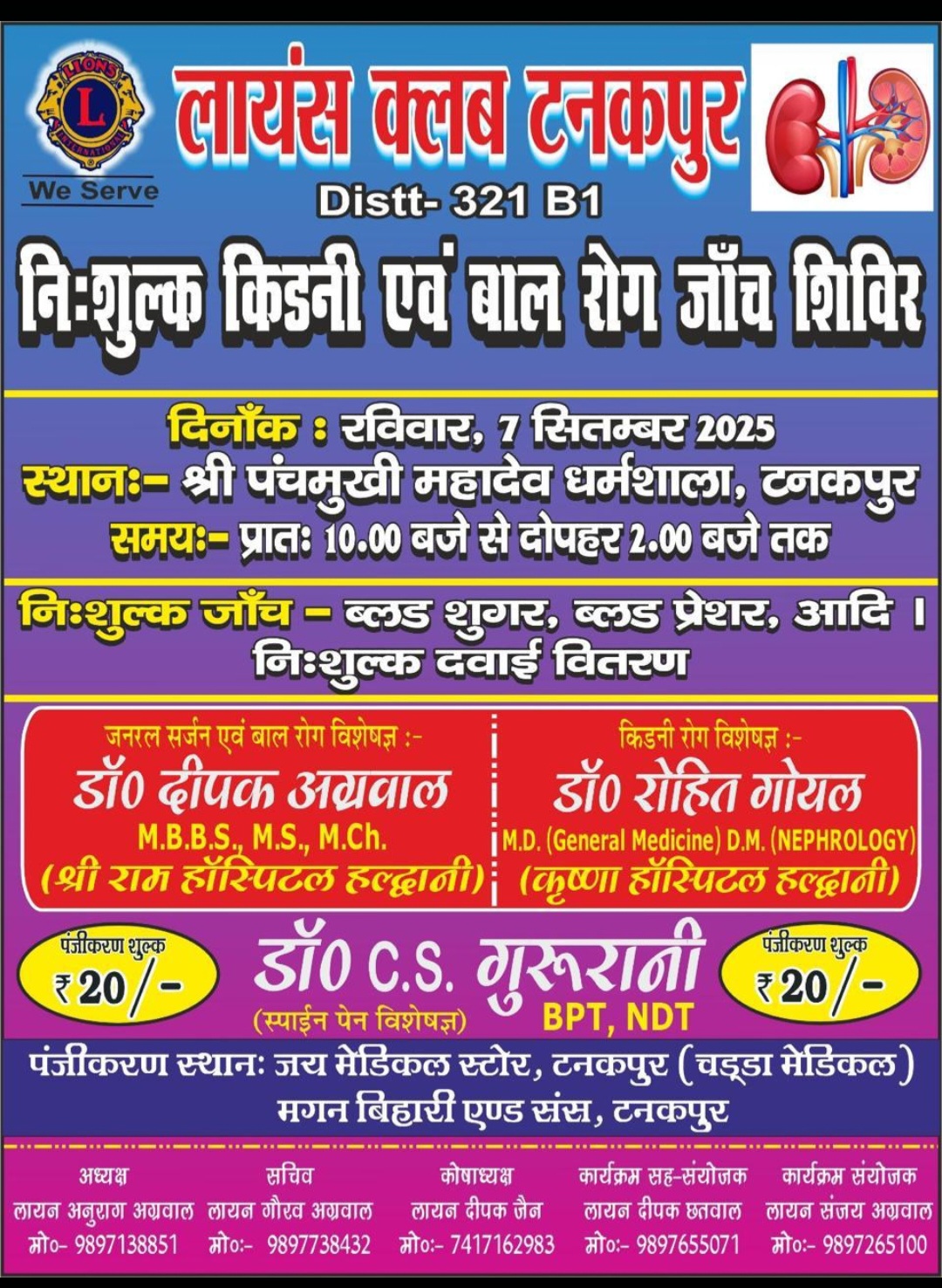 टनकपुर/ लायंस क्लब टनकपुर आगामी माह सितम्बर मे तहसील पूर्णागिरि क्षेत्र टनकपुर में एक स्वास्थ्य शिविर आयोजित करेगा, जिसमे बालरोग, किडनी एवं स्पाइन पेन विशेषज्ञ, नागरिकों बच्चों व महिलाओं का निःशुल्क स्वास्थ्य परीक्षण कर उन्हे उचित परामर्श देंगे। एवं आवश्यक दवाएं निःशुल्क उपलब्ध करायी जायेगी। साथ ही शिविर में ब्लड शुगर, ब्लड प्रेशर, की जांच भी निशुल्क रखी गई है।