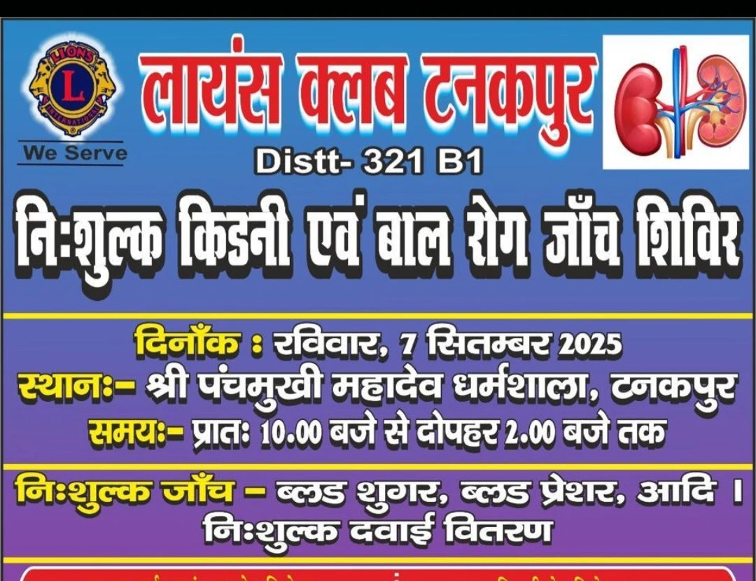 लायंस क्लब टनकपुर का निशुल्क स्वास्थ्य शिविर अगले माह : शिविर में किन-किन रोगों का होगा उपचार देखें खबर