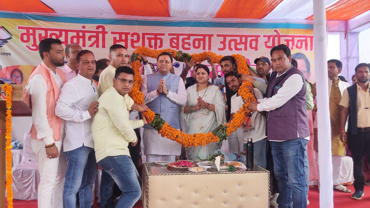 इससे पूर्व मुख्यमंत्री श्री धामी का जनपद आगमन पर जिलाधिकारी नवनीत पांडेय सहित क्षेत्रीय जनप्रतिनिधियों, स्थानीय महिलाओं,आम जनता द्वारा उनका स्वागत एवं अभिनंदन किया तथा माननीय मुख्यमंत्री द्वारा जनता का अभिवादन स्वीकार किया। इस अवसर पर स्कूली छात्र,छात्राओं द्वारा स्वागत एवं सांस्कृतिक कार्यक्रम प्रस्तुत किए गए। कार्यक्रम में बोलते हुए मुख्यमंत्री ने जनपद की स्वयं सहायता समूह की महिलाओं द्वारा हस्तनिर्मित पिरूल, ऐपण, सूत व अन्य स्थानीय उत्पादों से बनाई गई राखियों व अन्य निर्मित उत्पादों की सराहना की। उन्होंने कहा कि *हमारे जनपद की माताएं व बहने "वोकल फॉर लोकल" को चरितार्थ कर जहां स्थानीय उत्पादों को बढ़ावा दे रही है, वहीं अन्य स्थानीय महिलाओं को भी रोजगार उपलब्ध कराकर उन्हें भी आर्थिक में महिला स्वयं सहायता समूहों द्वारा सराहनीय कार्य किया जा रहा है*। उन्होंने कहा कि महिलाओं को आर्थिक रूप से सशक्त बनाने के लिए महिला स्वयं सहायता समूहों को 05 लाख रूपये तक का ब्याज मुक्त ऋण सरकार द्वारा दिया जा रहा है। उन्होंने कहा कि *महिलाओं को मजबूत बनाने के लिए राज्य में महिला सशक्त बहना उत्सव योजना शुरू की गई है।