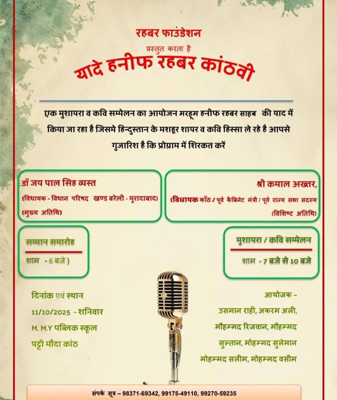कांठ: (मुरादाबाद) रहबर फाउंडेशन की ओर से आगामी 11 अक्टूबर यानी कल शनिवार की शाम मशहूर शायर यादे हनीफ रहबर कांठवी की याद में एक कवि सम्मेलन और मुशायरा का आयोजन नगर क्षेत्र के एम एम वाई पब्लिक स्कूल पत्ती मौढा कांठ में किया जाएगा। जिसे लेकर पूरे जोर शोर के साथ तैयारी की जा रही है। साथ ही उत्साह का माहौल भी बना हुआ है। कार्यक्रम को लेकर मास्टर रिजवान ने बताया कि कार्यक्रम में कई नामचीन मशहूर शायर और कवी हिस्सा लेंगे।