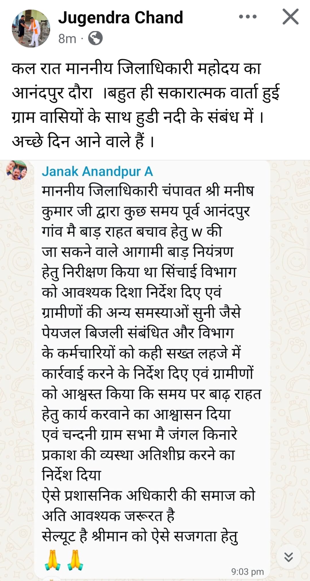 टनकपुर: जिलाधिकारी चंपावत मनीष कुमार के द्वारा प्रशासनिक उत्कृष्टता जनसेवा  और जनपद वासियों की समस्याओं के संदर्भ में किए जा रहे बेहतरीन कार्यों की स्थानीय लोग सराहना कर रहे हैं। आपको बता दे डीएम मनीष कुमार द्वारा जनहित की समस्याओं का तुरंत समाधान किया जाना लोगों के लिए किसी वरदान से कम साबित नहीं हो रहा है। सोशल मीडिया पर जिलाधिकारी की तारीफे स्थानीय लोगों द्वारा देखने को मिल रही हैं। अभी तीन रोज पूर्व पहाड़ों और मैदानी क्षेत्र में हो रही लगातार वर्षा से जिले के मैदानी क्षेत्र बनबसा में कई स्थानों पर जल भराव की स्थिति उत्पन्न हो गई थी। जिसके चलते स्थानीय लोगों का जनजीवन भी अस्त व्यस्त हो गया था। लेकिन इतनी बड़ी विपदा के दौरान भी जिलाधिकारी चंपावत मनीष कुमार के द्वारा बाढ ग्रस्त क्षेत्रों में पहुंच कर  राहत एवं बचाव कार्य के लिए विशेष प्रबंध करवाना वाकई काबिले तारीफ है। जिसके चलते स्थानीय लोग प्रशासन की तारीफ कर रहे हैं।