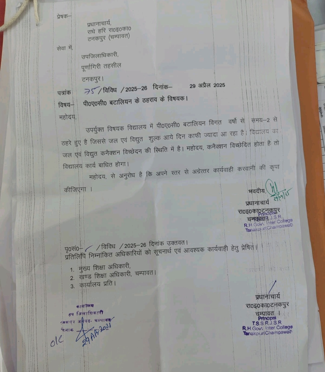 इसी क्रम में मंगलवार को विद्यालय के प्रिंसिपल हरिश्चंद्र पाठक द्वारा उपजिला अधिकारी आकाश जोशी को पत्र देकर मामले में कार्रवाई की जाने की मांग की गई है। एसडीएम को दिए गए पत्र में बताया कि बटालियन के ठहरने से जल एवं विद्युत बिलो में भारी बढ़ोतरी हो गई है। उन्होंने बिलों की अधिक बकाया राशि के चलते  कनेक्शन विच्छेदन होने का अंदेशा जताया है। प्रधानाचार्य ने इस मामले मे जल्द से जल्द कार्रवाई की जाने की मांग की है। उन्होंने इसकी प्रतिलिपि मुख्य शिक्षा अधिकारी एवं खंड शिक्षा अधिकारी को भी भेजी है।