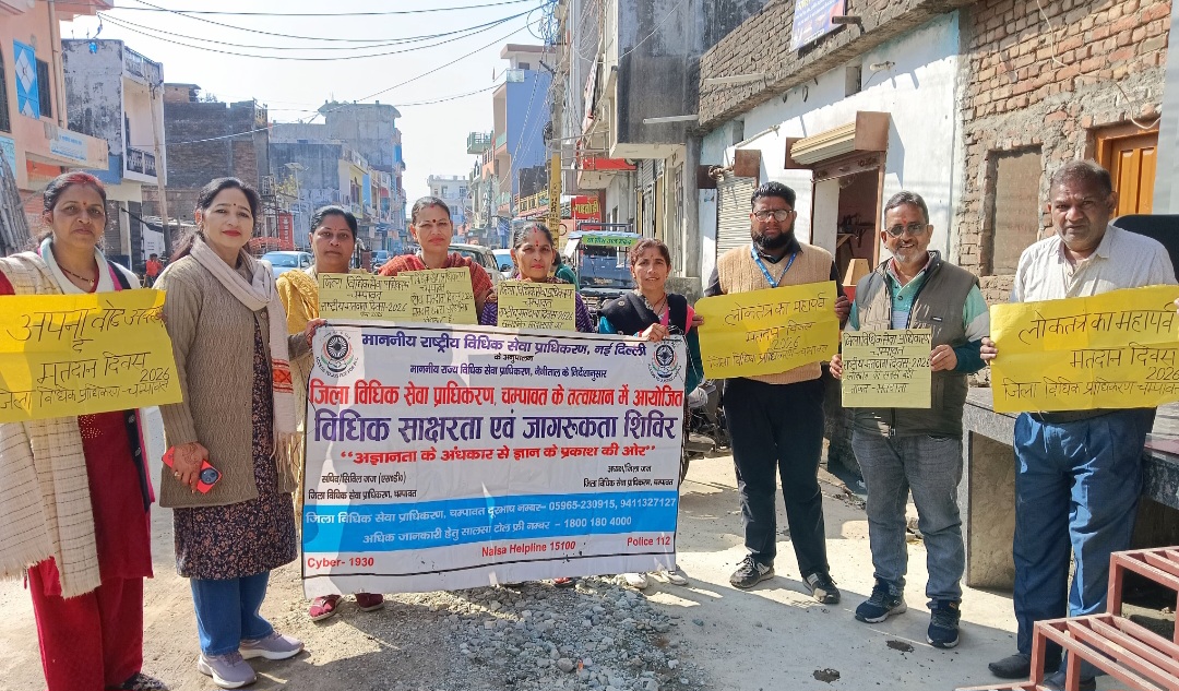 टनकपुर (चंपावत)। जिला विधिक सेवा प्राधिकरण चंपावत की ओर से टनकपुर क्षेत्र में राष्ट्रीय मतदाता दिवस पूरे उत्साह और गरिमा के साथ मनाया गया। इस अवसर पर बूथ संख्या 01 की बीएलओ सुषमा गुप्ता, बूथ संख्या 150 की बीएलओ चित्रा कश्यप, बूथ संख्या 151 की बीएलओ निर्मला बोहरा एवं चंद्रा तड़ागी, कोतवाली टनकपुर में हितेश वर्मा, गुरजीत सिंह, शंकर सहित पुलिस टीम, राजकीय उप चिकित्सालय में डॉ. मानवेंद्र शुक्ला, नर्सिंग स्टाफ, तहसील टनकपुर में सुनील वाल्मीकि तथा मनिहारगोठ क्षेत्र में मतदाताओं की सहभागिता के साथ कार्यक्रम आयोजित किए गए।